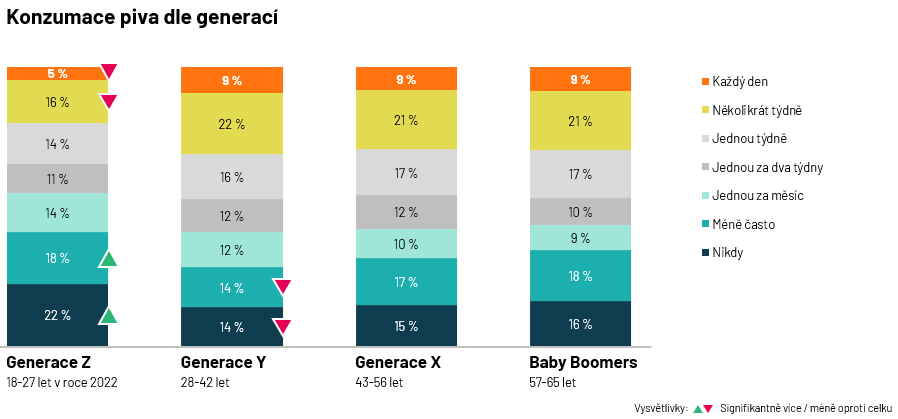 Zatímco téměř třetina (30 %) příslušníků generace X nebo tzv. baby boomers pije pivo každý den nebo několikrát týdně, v generaci Z už je to jen 21 % dotázaných