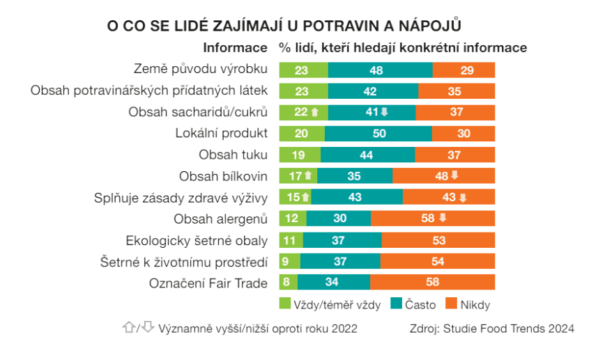 Dvě pětiny Čechů uvádí, že se stravují podle zásad zdravé výživy, což je nárůst oproti roku 2020. Trend zdravého životního stylu se odráží i ve zvýšeném zájmu o to, zda výrobek splňuje zásady zdravé výživy, ale i jaký má konkrétní obsah bílkovin, sacharidů a tuků. Na obalech tyto informace vyhledává minimálně polovina populace, asi pětina pravidelně.