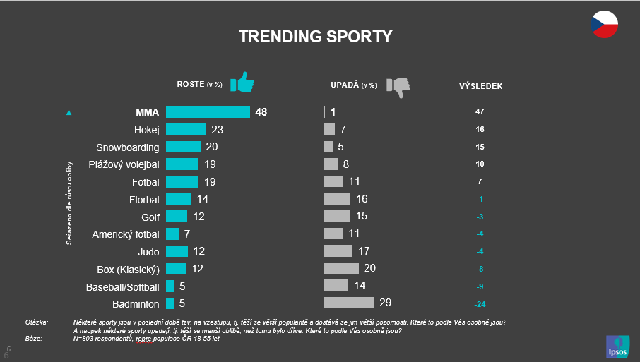 Rozhodně tedy nejde o sport jako každý jiný. Na tom se ostatně zcela neshodnou ani účastníci výzkumu. Myslí si to 36 % z těch, kteří sport MMA znají a 60 % z těch, kteří ho pravidelně sledují. Každopádně jde o sport, který se těší rostoucí popularitě a aktuálně překonává i mnoho déle etablovaných sportů v České republice a Slovensku.O výzkumu: