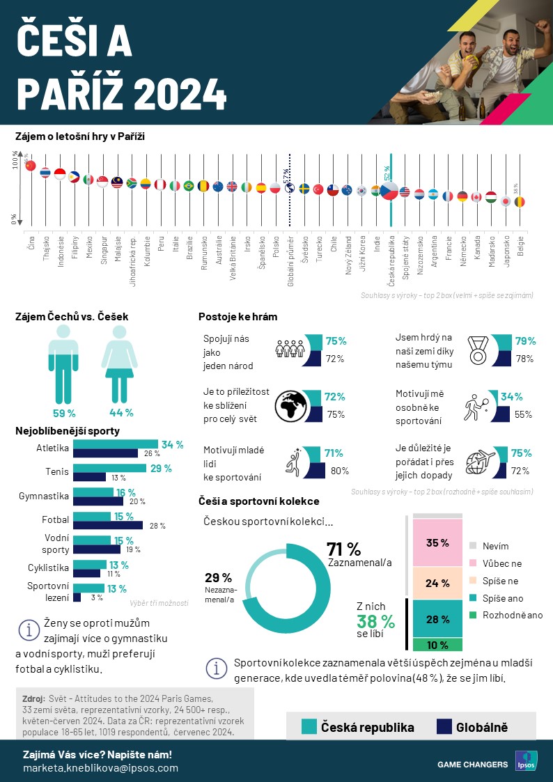 Téměř 8 z 10 lidí napříč světem se shoduje, že hry v Paříži jsou pro celý svět příležitostí ke blížení a spolupráci (souhlas 72 % v ČR, 75 % globálně), sbližují nás jako jeden národ (75 % ČR, 72 % globálně) a že jsou lidé díky sportovnímu týmu hrdí na svoji zemi (79 % v ČR, 78 % globálně).
