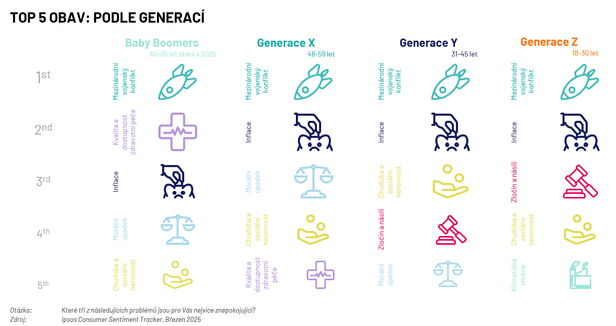 Obavy z vojenského konfliktu a kriminality: Největší obavou českých spotřebitelů v současnosti jsou důsledky mezinárodního vojenského konfliktu, zejména v souvislosti s děním na Ukrajině. Generace Z za svou největší starost označuje rostoucí kriminalitu a násilí – uvedlo to 34 % lidí ve věku 18–30 let, oproti celkovým 25 % napříč populací.