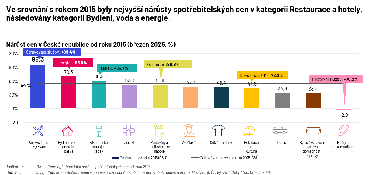 Inflace a ceny: Inflace sice klesla, ale vysoké ceny přetrvávají. Ve srovnání s rokem 2015 vzrostly spotřebitelské ceny celkově o 54 %, nejvýrazněji v kategorii stravovacích služeb (restaurace, kavárny), kde se ceny téměř zdvojnásobily. O něco méně vzrostly ceny energií. Ceny v kategorii potravin a nealkoholických nápojů vzrostly sice „jen“ o polovinu, nicméně spotřebitelé jsou na vývoj cen potravin mimořádně citliví. Tato kategorie patří mezi základní životní potřeby a představuje druhou největší položku ve výdajích domácností – hned po nákladech na bydlení.