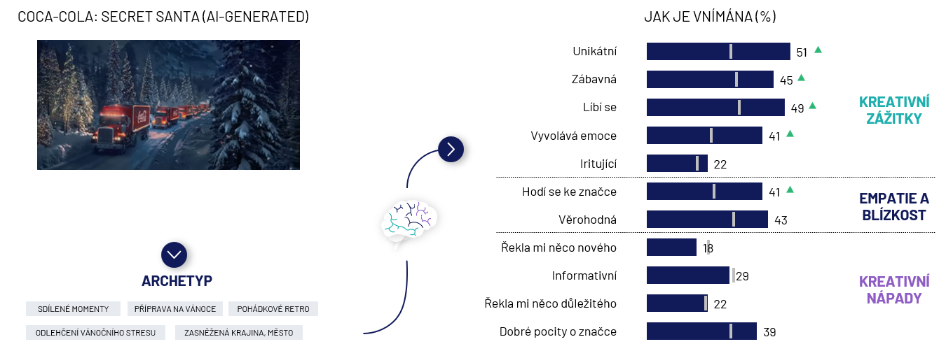 Kdo by si ještě dokázal představit Vánoce bez Coca-Coly? Letos ale značka přišla s odvážným krokem. Vánoční spot vygenerovala umělá inteligence (AI). Značce to určitě přidalo na jedinečnosti, ale ne vždy to musí vyjít, jak ukazují výsledky naší studie Misfits and the Machine. Nicméně v případě Coca-Coly to vyšlo. Vánoční reklama k té značce prostě patří. S nebo bez AI je v případě Coca-Coly jedno, u ní to prostě funguje.