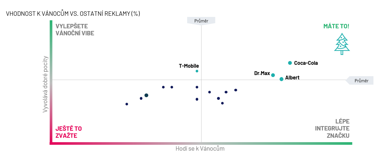 Našli jsme mezi nimi hvězdu? Rozhodně ano, a dokonce to byly hvězdy dvě. Reklamy značek, které se nejvíce hodí k Vánocům, a kromě toho navíc vyvolávají dobré pocity o značce jsou Coca-Cola a Dr. Max. Na paty jim ale šlapou další dvě značky, T-Mobile a Albert. Podívejme se na detaily a nechme se inspirovat.