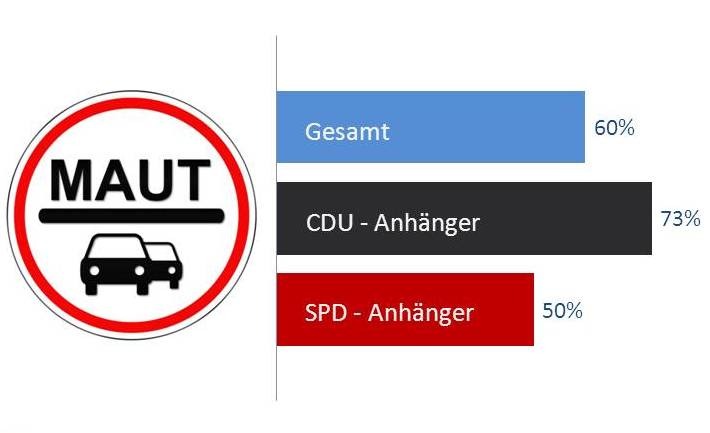 Während sich die Maut-Pläne auf eine breite Mehrheit unter den Wählern der Unionsparteien stützen, sind die Anhänger der SPD in dieser Frage deutlich gespaltener. Rund die Hälfte (50%) der SPD-Wähler befürworten die Maut-Pläne der Union, 46 Prozent lehnen sie ab. Im Westen der Republik liegt der Anteil der Befürworter mit 61 Prozent deutlich höher als im Osten (54 Prozent).