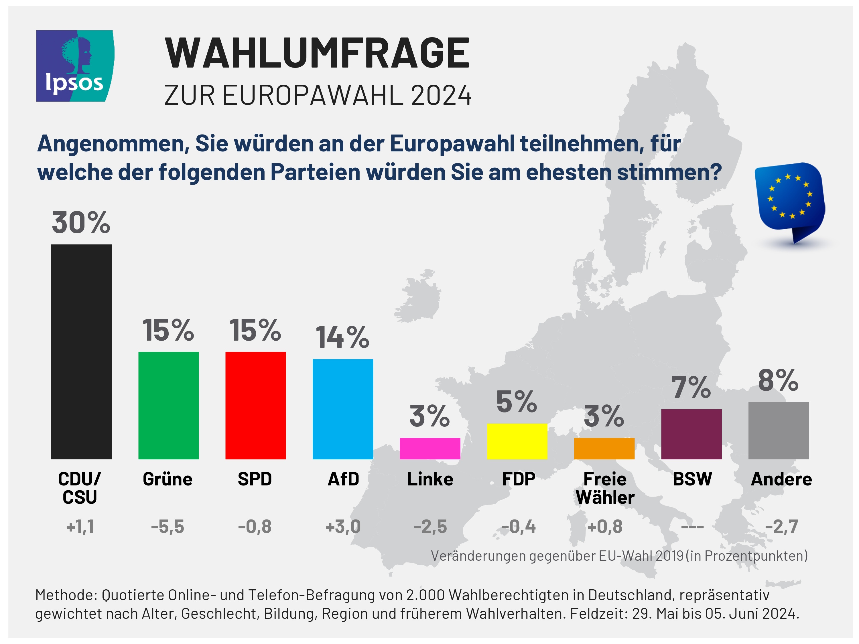 Am 09. Juni entscheiden die Bürger:innen Deutschlands darüber, wer sie künftig im Europäischen Parlament vertreten soll. Laut der neuesten Ipsos-Wahlumfrage kann die Union mit einem klaren Sieg rechnen. 30 Prozent der Wahlberechtigten würden am ehesten für CDU/CSU stimmen – ein leichtes Plus von 1,1 Prozentpunkten im Vergleich zur letzten Europawahl im Jahr 2019.