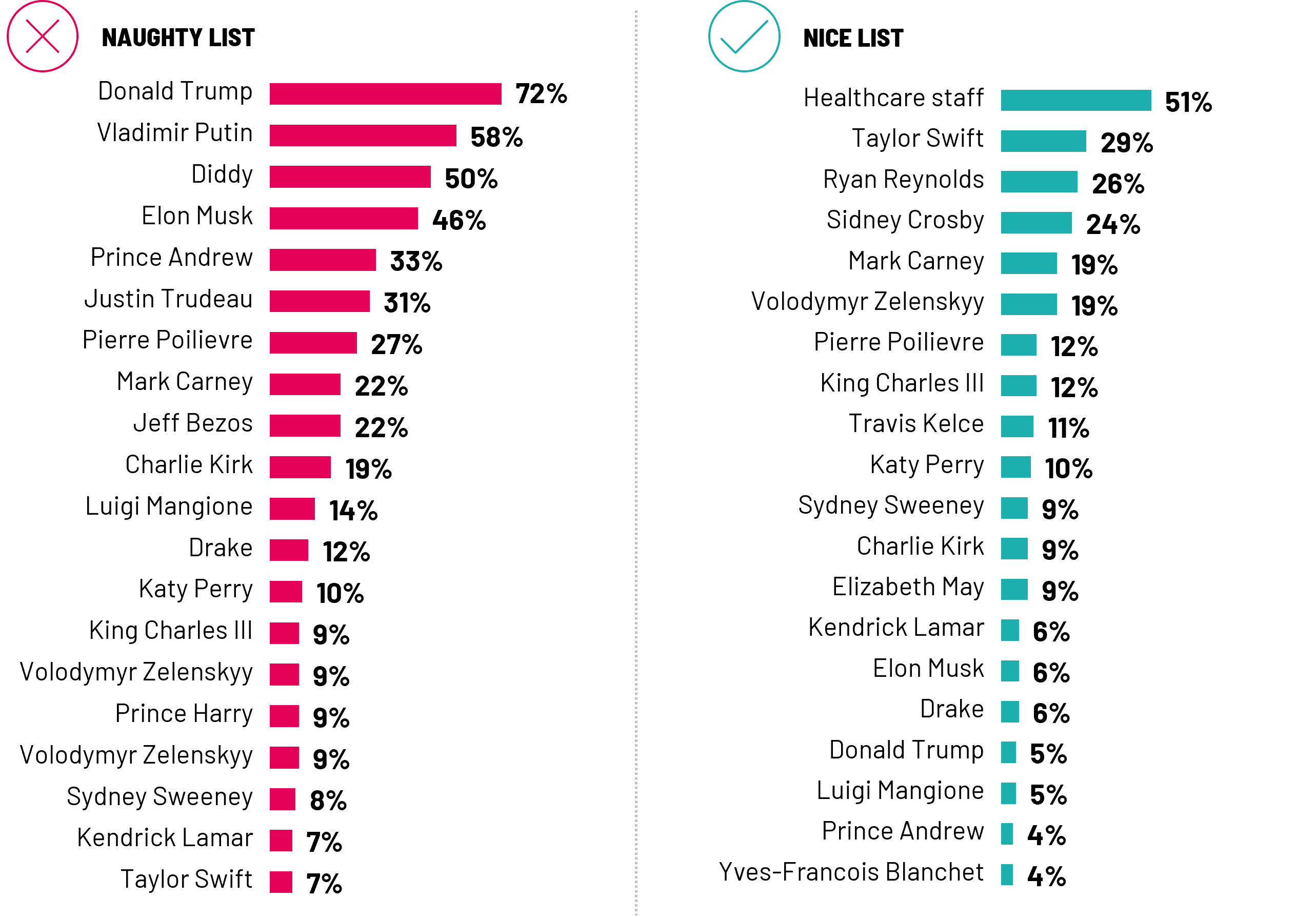 If Canadians were assisting Santa in the creation of his naughty and nice list this year, Donald Trump would make it to the top of the naughty list (72%), likely given his threats to turn Canada into the 51st state. In second place, six in ten Canadians expect Vladimir Putin (58%) to be on Santa’s naughty list. Half of Canadians place Diddy (50%) in third place (not even making top 20 Nice List). Prince Andrew (33%), Justin Trudeau (31%), and Pierre Poilievre (27%) rank similarly on the naughty list. Fairly close behind, one in five place Mark Carney (22%), Jeff Bezos (22%), and Charlie Kirk (19%) in the naughty ledger.