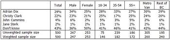 Notes: Adrian Dix is selected slightly more often than Christy Clark as the expected winner of the debate, with few British Columbians expecting a win from John Cummins or Jane Sterk. Nearly six-in-ten (59%) BC Liberal supporters expect Christy Clark to win and a similar proportion of NDP supporters (57%) expect Adrian Dix will win.