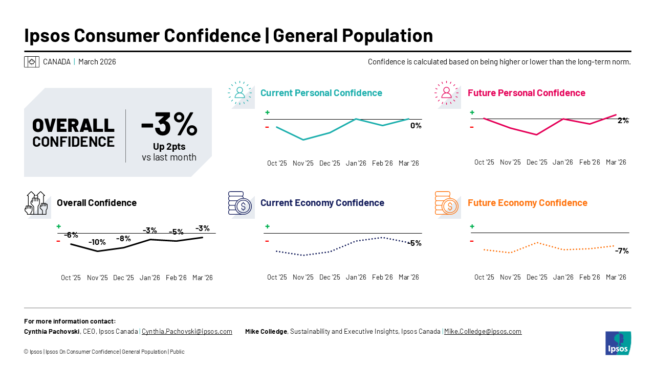 Data for Ipsos’ Consumer Confidence is powered by Global Advisor. Every month, Global Advisor surveys 30 countries, including Canada. This month’s results for Canada are based on online interviews with 1,000 adults aged 18-74, interviewed between February 20 and March 6, 2026.