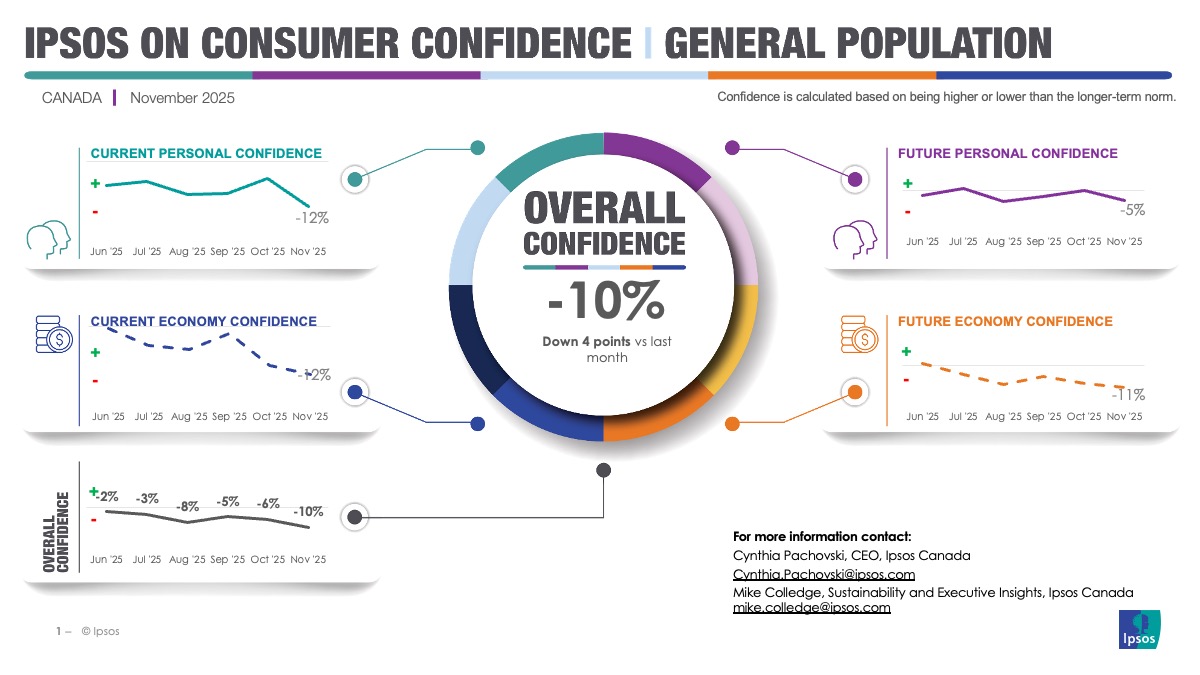 Data for Ipsos’ Consumer Confidence is powered by Global Advisor. Every month, Global Advisor surveys 30 countries, including Canada. This month’s results for Canada are based on online interviews with 1,000 adults aged 18-74, interviewed between October 24 and November 7, 2025.