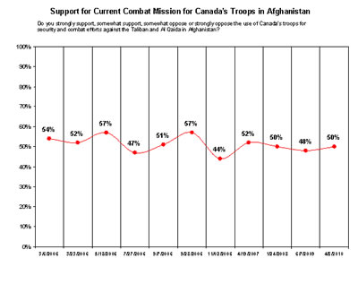 Since the start of Canada's mission, support for the use of Canada's troops for security and combat efforts against the Taliban and al Qaida in Afghanistan has remained remarkably consistent, through successes, drawbacks, casualties and scandals. Fully one half (50%) of Canadians currently `supports' (20% strongly/30% somewhat) the mission, while the other half (50%) `opposes' (26% strongly/24% somewhat) the mission. By comparison, in early 2006 Ipsos Reid reported that 54% supported the mission.