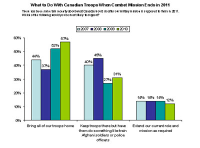 - Two in three (64%) Quebecers believe the troops should be brought home in 2011, followed by a majority of those living in Alberta (60%), Saskatchewan and Manitoba (58%), Atlantic Canada (55%), Ontario (54%) and British Columbia (51%).