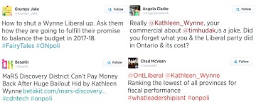 Discussions around the Liberals, meanwhile, have been focussed on Kathleen Wynne's promise to go from a deficit of $12.5 to fiscal balance in three years, despite also promising not to cut public service jobs or alter the terms of the collective bargaining agreements with the public sector unions. Efforts to play up the MaRS real estate bailout as a costly Liberal boondoggle potentially worse than the $1.1 billion gas-plants scandal gained some traction among Conservative supporters. With increased attention, mentions of the Liberal campaign are increasingly negative (52% negative compared to 10% positive and 38% neutral).
