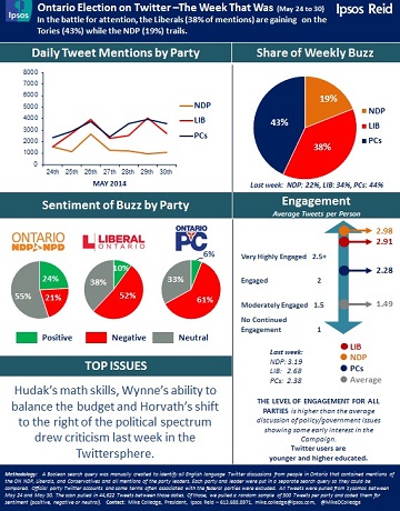 On average Canadians engage on Twitter 1.49 times when discussing a public issue (average taken from Ipsos studies conducted throughout 2013-14) however, engagement around all three parties during week three of the Ontario campaign is considerably higher (2.98 for the NDP, 2.91 for the Liberals and 2.28 for the Conservatives) which means Ontarians are engaging in the election more deeply (with more back and forth discussion) than they have on past public issues.