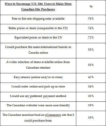 With such a substantial amount of Canadian online shoppers seeking cross-border deals, many Canadian companies may lose out on business this holiday season and could be in search of ways to get this business back. Among Canadian online shoppers who have shopped at U.S. sites, three quarters believe that having free or flat rate shipping rates available (76%), having better prices or deals (74%), or even equivalent prices or deals to the U.S. (72%) would encourage them to make more online purchases from Canadian sites rather than American ones. The following table outlines specific ways Canadian online shoppers who've made purchases from American websites could be encouraged to make more purchases from Canadian sites.