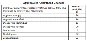 Six-in-ten (60%) British Columbians say they approve of the changes to the HST announced by the provincial government, including 16% who `approve strongly'. One-third (33%) say they disapprove of the changes, including two-in-ten (20%) who `disapprove strongly'. Seven percent are undecided.