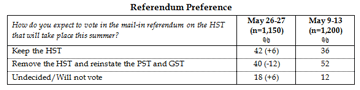 With the announced changes in mind, British Columbians are now split in their referendum preferences. Forty-two percent say they expect to vote to `keep the HST' while 40% say they expect to vote to `remove the HST and reinstate the PST and GST'. Eighteen percent are undecided or say they will not vote in the referendum.