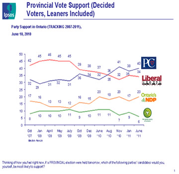 These are the findings of an Ipsos Reid poll conducted exclusively for Postmedia News, Global Television and NewsTalk 1010 from May 17 to June 9, 2011. For the survey, a representative randomly selected sample of 802 adults living in Ontario was interviewed by telephone. With a sample of this size, the results are considered accurate to within 1773.5 percentage points, 19 times out of 20, of what they would have been had the entire adult population living in Ontario been polled. These data were weighted to ensure that the sample's regional and age/sex composition reflects that of the actual Ontarian population according to Census data.