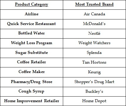 Canadians and Quebecers reported brands they trust most in over 40 product categories. Some of the winning brands are listed below: