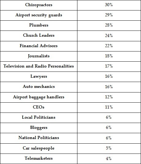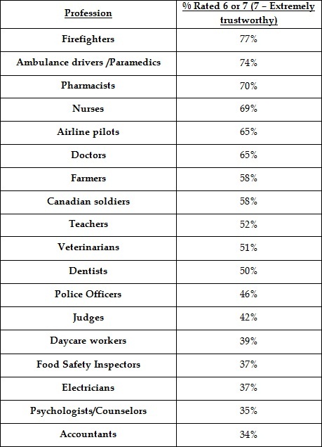 Canadians were also asked to rate their trust on a list of professions and industries. Professions rated highest in trust are firefighters (77% trust), ambulance drivers/paramedics (74% trust), and pharmacists (70%). Among some of the least trusted are national politicians (6%), car salespeople (5%) and telemarketers (4%). The top most trusted institutions are medical research (34%), tourism (26%), and airlines (26%). The full list of professions is below, and the full list of institutions is in the data tables on the Ipsos News website: