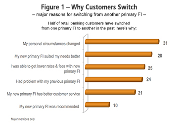 But despite this very positive environment, significant `at risk' customer groups exist within the market. For this article, we will define `at risk' customers as those who have a higher potential than others for changing their patterns of banking behaviour to the detriment of their existing primary banking relationship. A primary banking relationship is defined as the financial institution that a customer uses most often. In many cases, `at risk' customers have perceptions and attitudes that make them more likely to change their banking relationships over time. Although only a small proportion of customers switch primary financial institutions during the course of a year, this behaviour becomes significant when seen over the long term. Fully half of primary banking customers claim to have switched primary financial institutions in the past, making it prudent to have a deep understanding of what can stimulate this type of behaviour in the present. As shown below in Figure 1, some key triggers for switching are within the power of institutions to manage.