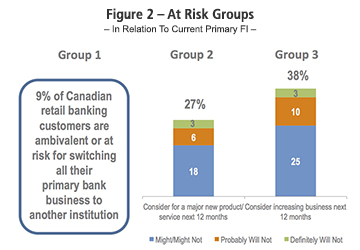 This article focuses on defining `at risk' groups and discussing ways in which financial institutions can work to create and cement new relationships by attracting `at risk' customers of other financial institutions. All information used is sourced from the Ipsos Reid Customer Satisfaction Index Study (CSI), a quarterly online survey on personal banking, encompassing more than 45,000 customer interviews per year. Questions are focused on overall customer satisfaction, attitudes and behaviours related to banking, as well as usage and rating of various banking channels and services among all key financial institutions across Canada.