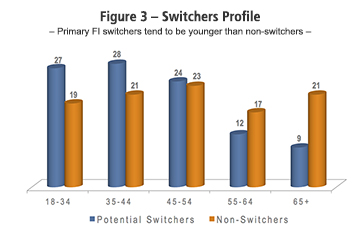 Identifying those customers who may switch wholesale to another FI can be challenging, especially from a demographic standpoint. Other than a marked skew towards customers under age 44 as shown in Figure 3 below, next 12 month switchers are not overly represented in specific income, education or occupation groups, nor are they markedly skewed by gender.