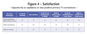 `At risk' customers, by definition, are less positive about their relationship with their primary FI. As Figure 4 highlights, they are notably less likely than other customers to feel that they are getting good value in the products and services they have and use, and less likely to feel that their business is valued. Financial institutions contemplating or currently working to attract `at risk' customers of other FI's need to ensure they are sending a strong message that new customers would be valued. Likewise, they must communicate in a clear and credible manner that the products and services offered to them will be superior in important ways to those currently being offered by their primary FI.