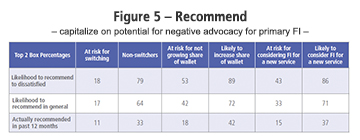 Not surprisingly, customers who are less convinced that their business is valued and that they are getting good value in return for their money are less likely to be advocates for their own primary FI. It is likely that significant numbers of `at risk' customers are actively expressing negative opinions about their FI to others. Financial institutions choosing to work to attract `at risk' customers who harbour negative feelings for their current primary FI need to tap into and leverage the sense of frustation and discontent these customers have. Solutions to commonly experienced problems at competitor FI's, as well as perceived deficiencies with other FI's products and services, can be directly addressed and highlighted in advertising and promotional efforts. Figure 5 illustrates how important it is to encourage loyal customers to help create a positive impression among people `at risk' with other institutions. Mobilizing and encouraging satisfied customers to make positive recommendations has to be part of any successful recruitment of dissatisfied competitor customers.