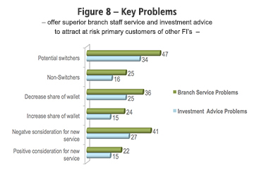 When asked what specific types of problems they were having with their branch experience, `at risk' primary FI customers mentioned two main types of problems much more often than others did. These were problems related to staff issues and to financial/investment advice received.