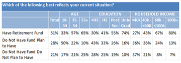 Lower education attainment and income appear to play a big role in deferring Canadians' planning decisions or eradicating it altogether. Those currently without a retirement fund, whether they plan to eventually have one or not are much less likely to have a university degree compared to those with a fund, and their reported annual household income is more likely to be under $40,000. Being "financially excluded" is correlated with lower income and education levels. For some, being excluded is not by choice as they are simply trying to make day to day ends meet.