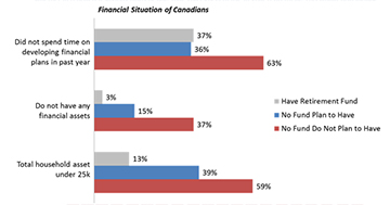 A majority (63%) of these "excluded" households did not spend any time in the past year developing plans for their savings or investments, retirement, insurance, tax, children's education or estate. When asked about a list of assets ranging from cash savings, tax free savings, life insurance, pension savings, non-registered investments, to annuities and more, close to two in five (37%) do not have any. More than half of them (59%) report household financial asset of less than $25,000, or none at all. Those with no retirement funds but planning to have some are faring better in comparison.