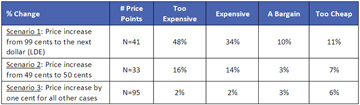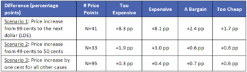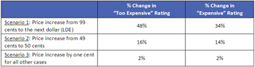 The analysis showed that while the difference in prices for all three cases was a penny, a change in price from 99 cents to the next dollar resulted in a significant increase in expensiveness perceptions. A similar, but smaller effect was also seen when the price changed from 49 cents to 50 cents. Changing the price in all other scenarios had virtually no impact on perceptions around expensiveness.