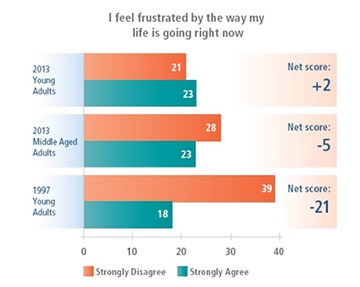 Frustration levels are rising substantially which is likely driven by diminishing job prospects, an increasing need for higher levels of education, and the subsequent delay in young adults launching independent lives with families of their own. Using a 0 to 10 scale, "strongly agree" representing those responding 8, 9 and 10 and "strongly disagree" representing those responding 0, 1 and 2, we asked "I feel frustrated by the way my life is going right now":
