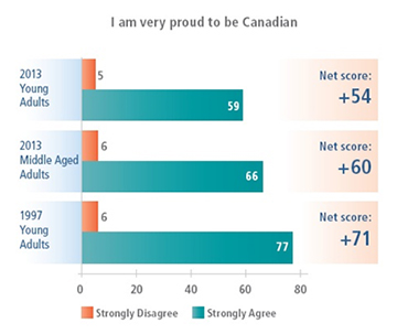 Young Canadians today have considerably less pride in being Canadian than youth in 1997. Whether being Canadian has lost some of its luster, or if greater awareness of the rest of the world through travel, education and the Internet has given young people a wider point of comparison, the results are striking. Using a 0 to 10 scale, "strongly agree" representing those responding 8, 9 and 10 and "strongly disagree" representing those responding 0, 1 and 2, we asked "I am very proud to be Canadian":