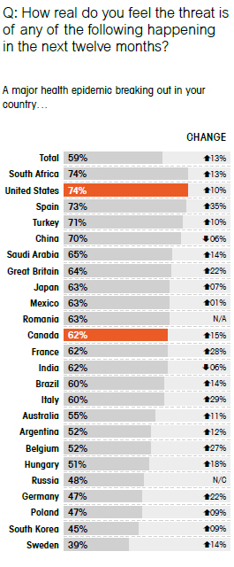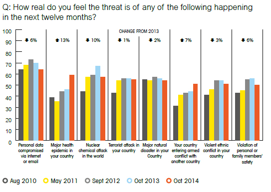 Let's face it though, while having your personal data compromised creates a sense of violation and potentially a major inconvenience in your life, it won't kill you. For that we have to turn to our next big worry - the outbreak of a major health epidemic in our home country (59%). This is up 13% in 2014, and is especially strong in South Africa, the US, and Spain. This is clearly being driven by news about the outbreak of the Ebola virus in Africa.
