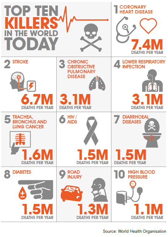 What does this tell us? For the most part, the biggest risks we face are diseases that can't be passed from person to person. Indeed, many of these diseases are brought on by our own poor lifestyle choices related to smoking, diet and exercise. In fact, the top 5 killers are all heart or lung related diseases.
