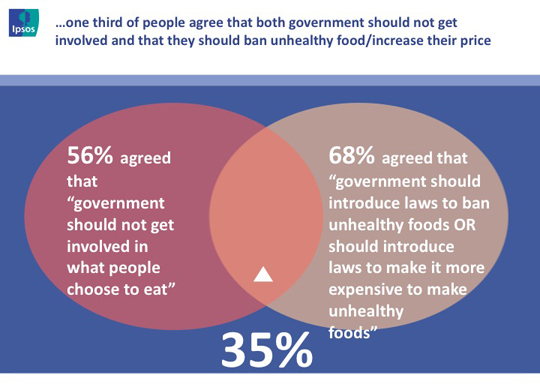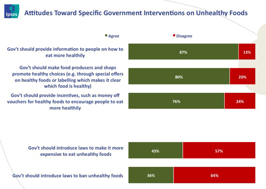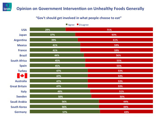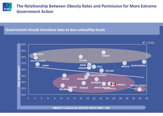 Particularly interesting in the Ipsos study is that obesity rates do not seem to be linked to public sentiment for strong government intervention on unhealthy foods. Using opinions on government banning unhealthy foods as the measure, countries with higher obesity rates (including Canada), are among the least likely to believe that governments should ban unhealthy foods.