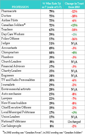 Trust in a few professions, however, has increased. Significantly more Canadians trust Canadian soldiers than said the same about the Canadian Forces in 2003 (72%, up 15 points). Slightly more Canadians now trust daycare workers (59%, up 1 point), chiropractors (44%, up 4 points) and municipal politicians (17%, up 3 points). The following is a list of professions studied, from most trusted to least trusted, along with the change in the proportion of Canadians who deem these professions to be trustworthy:
