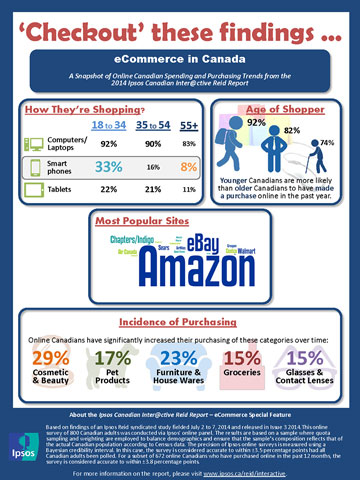 This release is based on the findings of an Ipsos Reid syndicated study, The Ipsos Canadian Inter@ctive Reid Report, fielded July 2 to 7, 2014 and released in 2014-Issue 3. This online survey of 800 Canadian adults was conducted via Ipsos' online panel. The results are based on a sample where quota sampling and weighting are employed to balance demographics and ensure that the sample's composition reflects that of the actual Canadian population according to Census data. The precision of Ipsos online surveys is measured using a Bayesian credibility interval. In this case, the survey is considered accurate to within +/- 3.5 percentage points had all Canadian adults been polled. For a subset of 672 online Canadians who have purchased online in the past 12 months, the survey is considered accurate to within +/- 3.8 percentage points.