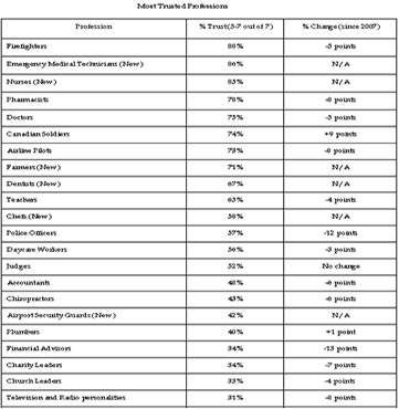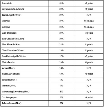 Below is a list of all professions studied, along with tracking back to an identical poll conducted five years ago, where applicable: