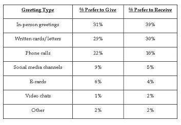 New modes of communication have allowed Canadians to give and receive holiday greetings in a number of ways. Despite access to new ways of giving and receiving holiday greetings, Canadians still prefer traditional and conventional methods.