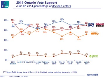 These are some of the findings of an Ipsos Reid poll conducted between June 3 (after the debate) until June 6, 2014, on behalf of CTV and CP24. For this survey, a sample of 2,140 Ontarians from Ipsos' Canadian online panel was interviewed online. Weighting was then employed to balance demographics to ensure that the sample's composition reflects that of the adult population according to Census data and to provide results intended to approximate the sample universe. The precision of Ipsos online polls is measured using a credibility interval. In this case, the poll is accurate to within +/-2.4 percentage points had all adults in Ontario been surveyed.