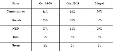 The Bloc would receive 6% of the vote nationally (25% in Quebec), which hasn't changed from last week and is down 1 point from September, and the Green Party and Elizabeth May would receive 2% of the vote (showing no change from last week and down 1 point from September). One percent (1%) of the vote would go to some other party, while 15% remain undecided.