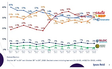 If an election were held tomorrow, the Conservatives led by Prime Minister Stephen Harper would receive the support of 30% of decided voters (down 1 point since last week and 2 points since September), while the Liberals and Justin Trudeau would receive 31% of the popular vote (down 2 points since last week and showing no change since September).