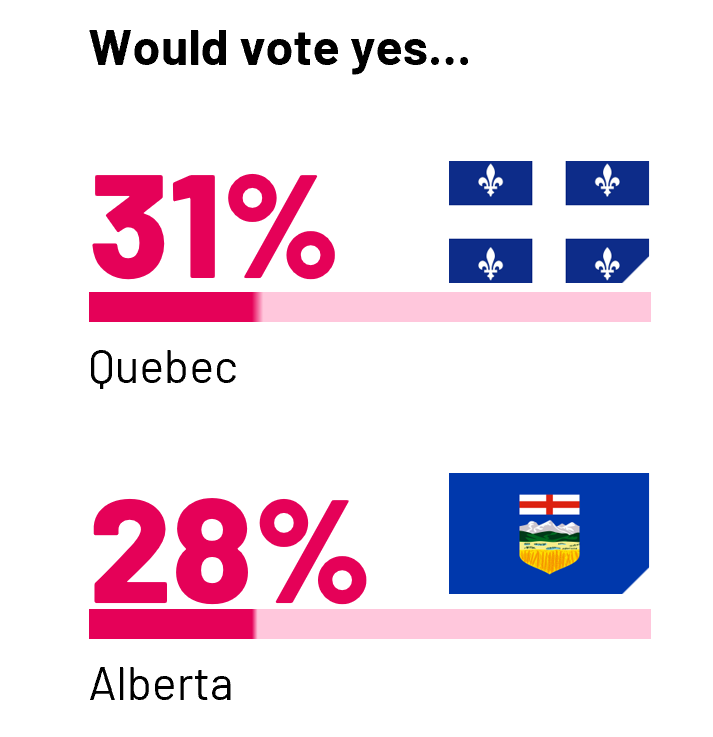 When asked if they would vote for their province to begin the process of separating from Canada and seeking a new agreement to define its future relationship with the country, approximately three in 10 residents of both Alberta (29%) and Quebec (31%) say yes. This includes those who say they would definitely or probably vote yes, and those who say they would lean toward voting yes.
