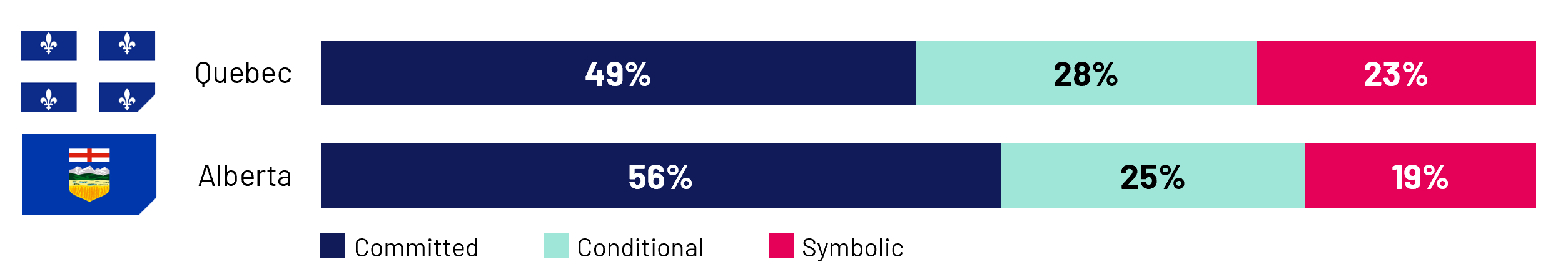 In Alberta, 55% of initial separatist supporters are "committed,” willing to pay serious economic and social costs for independence. Another 25% are "conditional," maintaining support under some but not all conditions, while 20% are "symbolic," using the independence threat primarily to express frustration rather than genuine intent to leave.