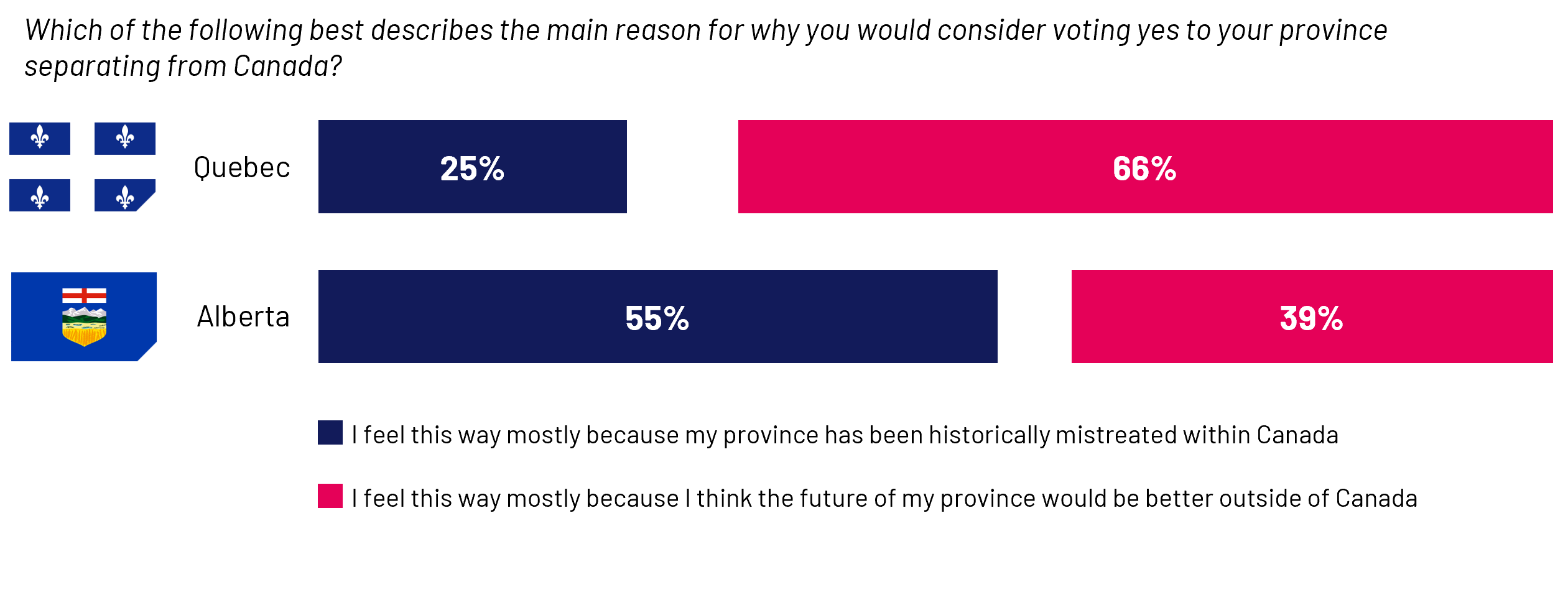 Albertan and Quebecer separatists cite different reasons for wanting to vote for independence. Quebecers are more likely to say their reason for voting “yes” is that Quebec’s future would be served better outside of Canada, while Albertans are more likely to say that their reason for voting “yes” is that Alberta has historically been mistreated within confederation.