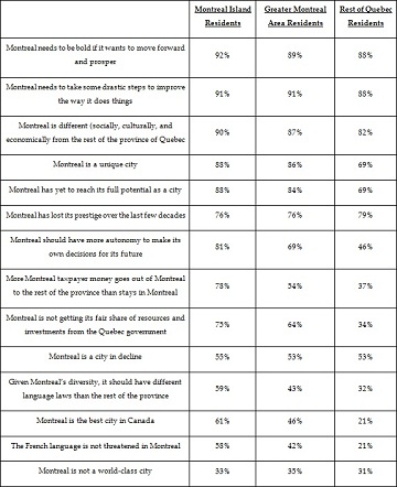While Quebecers are aligned on the notion that bold and drastic steps need to be taken, residents of different regions differ substantially on a number of issues ranging from whether or not Montreal should have more autonomy and investment from the provincial government to whether or not the city should have different language laws due to its diversity. The table below outlines statements outlining how Montreal differs from the rest of the province of Quebec and what proportion of each area resident `agrees' with the sentiment: