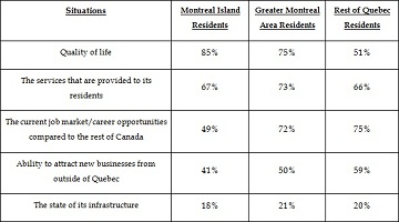 Overall, at least two in three believe that Montreal is a world class city, but residents of different regions have differing opinions when looking at the quality of life that Montreal provides as one of its biggest strengths. Interestingly, residents outside of Montreal are more likely to rate the city's current job market and ability to attract new business from outside the province as `good' than those from the Island or the GMA. The following table outlines different qualities of Montreal as well as the proportion of region residents who rate these current situations as `good':